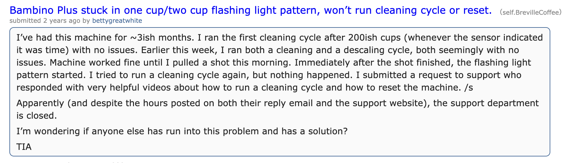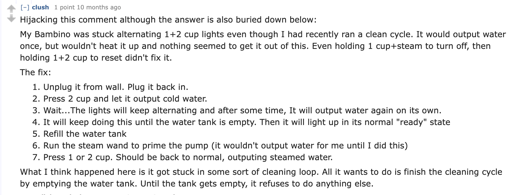 from reddit: “Bambino Plus stuck in one cup/two cup flashing light pattern, won’t run cleaning cycle or reset.”